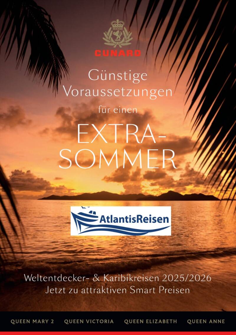 Noch mehr Cunard-Traumangebote gefällig ? Dann laden Sie sofort den Sonderprospekt "CUNARD EXTRA SOMMER" 2025 / 2026 mit tollen Angebotspreisen. Sie werden von den Cunard-Königinnen bereits erwartet...