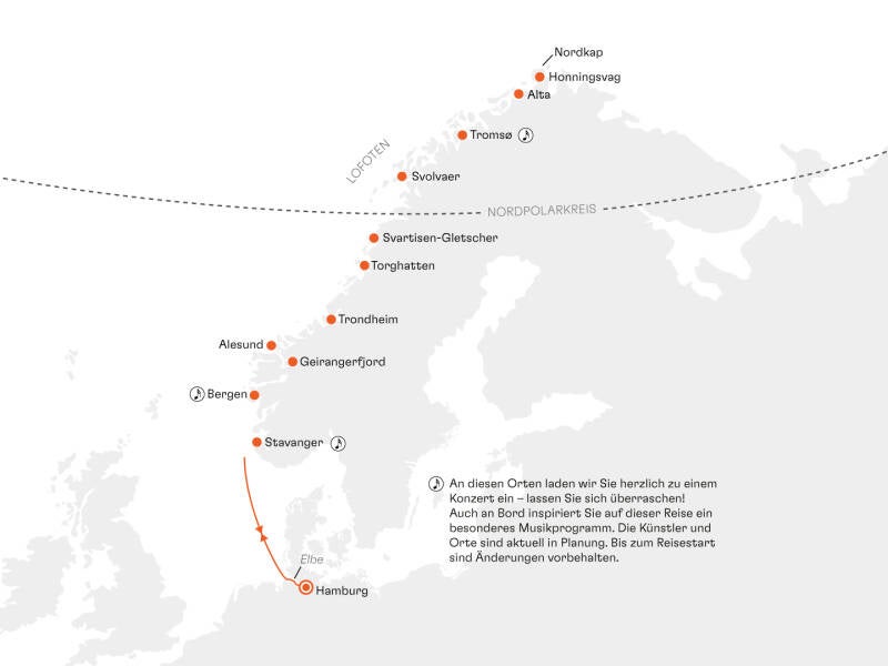 Route: Hamburg – Bergen, Norwegen – Alesund, Norwegen – Torghatten, Norwegen – Tromso, Norwegen – Honnigsvag, Nordkap – Alta, Norwegen – Svolvaer, Lofoten/Norwegen – Svartisen, Norwegen – Trondheim, Norwegen – Geiranger, Norwegen – Stavanger, Norwegen - Hamburg