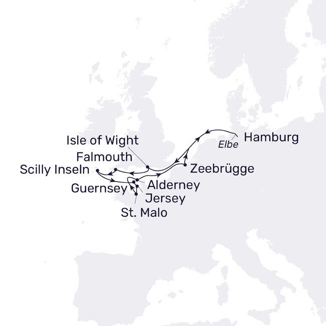 Route: Hamburg – Portsmouth, Großbritannien – Hugh Town/Isle of Scilly, Großbritannien -